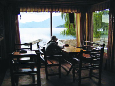 在泸沽湖边的玻璃屋酒吧消磨一个无所事事的下午。